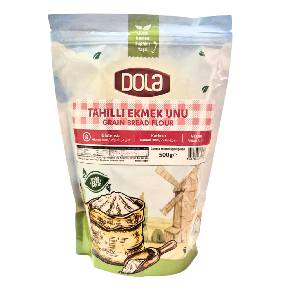 Dola Glutensiz Karabuğdaylı Tahıllı Ekmek Unu 500 gr, ev yapımı sağlıklı ve lezzetli ekmekler hazırlamak isteyenler için özenle seçilmiş karabuğday ve tahılların harmanlanmasıyla üretilmiş özel bir un karışımıdır.