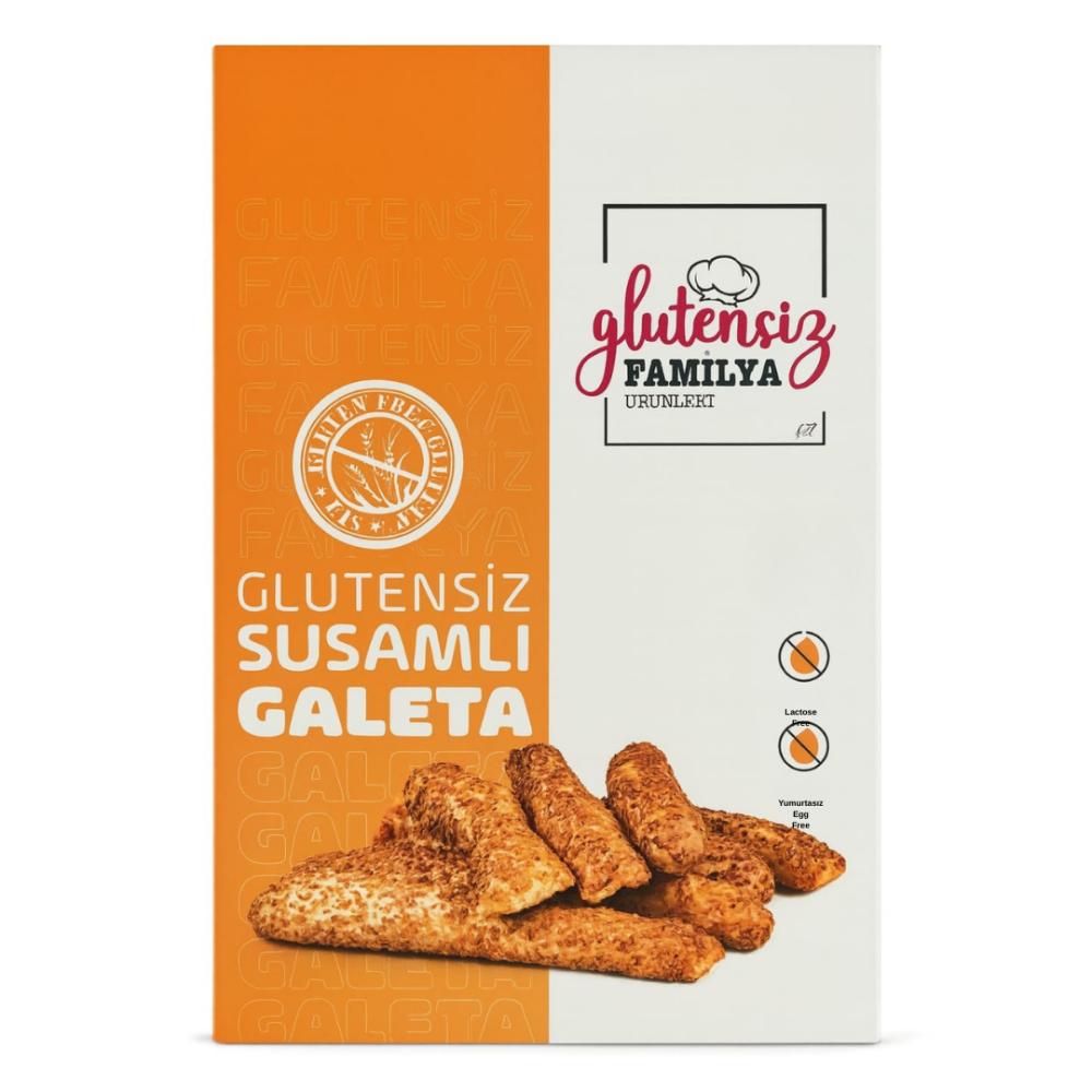 Familya Glutensiz Susamlı Galeta 110 g, glutensiz buğday nişastası ile hazırlanmış, susam kaplı kıtır bir atıştırmalıktır. Laktozsuz ve yumurtasız içeriği sayesinde özel beslenen tüketiciler için pratik ve lezzetli bir alternatiftir.
